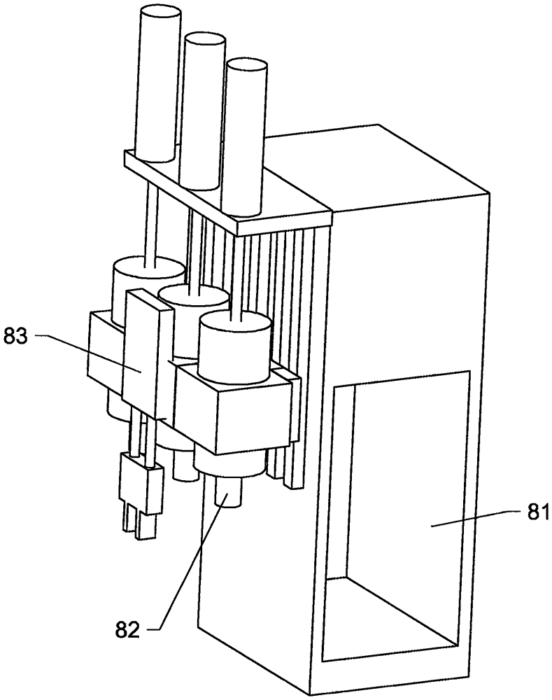 眼鏡內(nèi)框加工刀組裝置8包括與第一橫向?qū)к壔瑒?dòng)配合的座體81,所述座體81上設(shè)有可在豎直方向運(yùn)動(dòng)的切割刀82。眼鏡內(nèi)框加工刀組裝置8上還設(shè)有第一機(jī)械手83,第一機(jī)械手83用于抓取待加工料放入眼鏡內(nèi)框加工固定夾具5中進(jìn)行固定。
